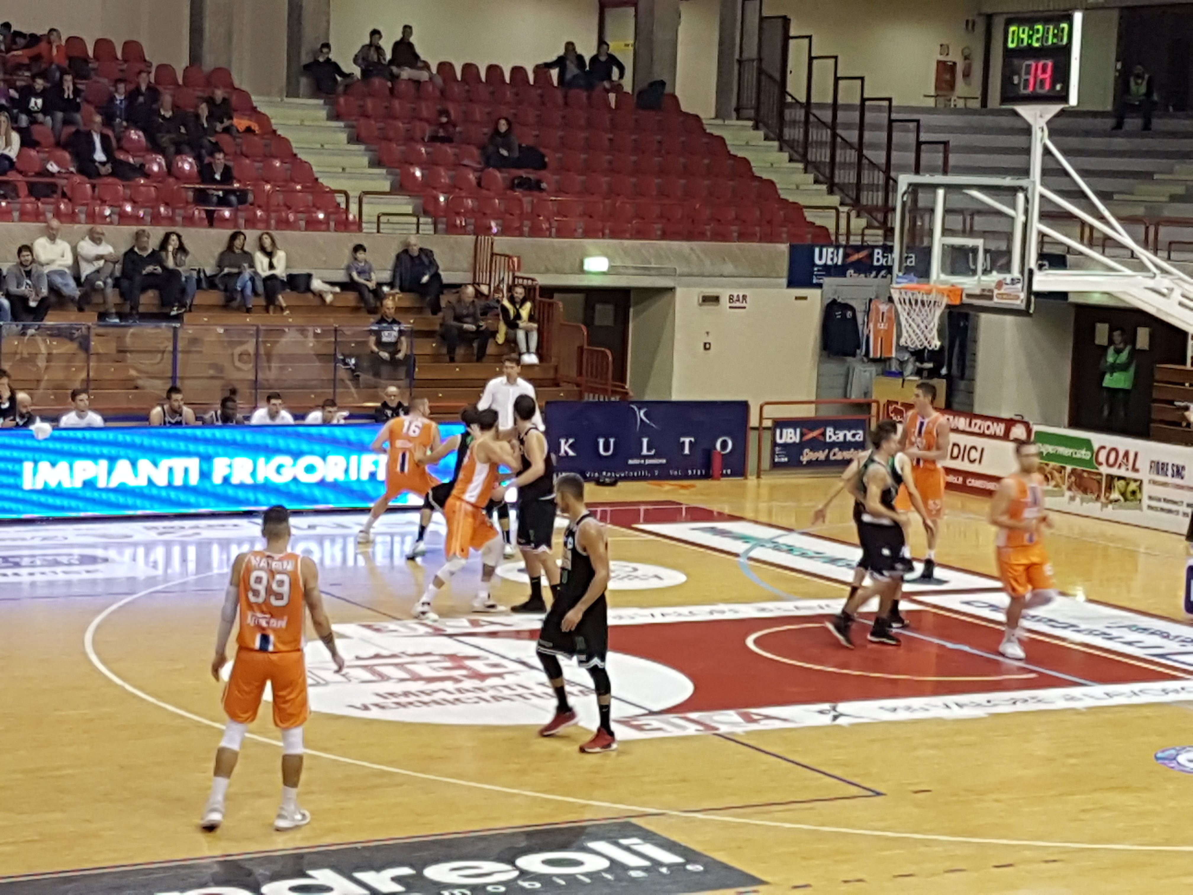 La curva invita i giocatori arancioblu a tirare fuori gli attributi. Bottioni e Giampieri non si arrendono e nonostante un Gueye inarrestabile, accorciano sul 53-62.