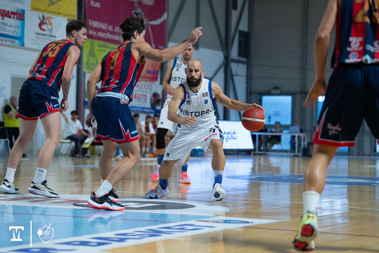 La Ristopro ha qualche guizzo da Centanni, oltre che da Granic, ma non prende mai ritmo in attacco e gli ospiti ne approfittano per andare al riposo lungo sul 32-38 con la tripla sul filo della sirena di Casanova.