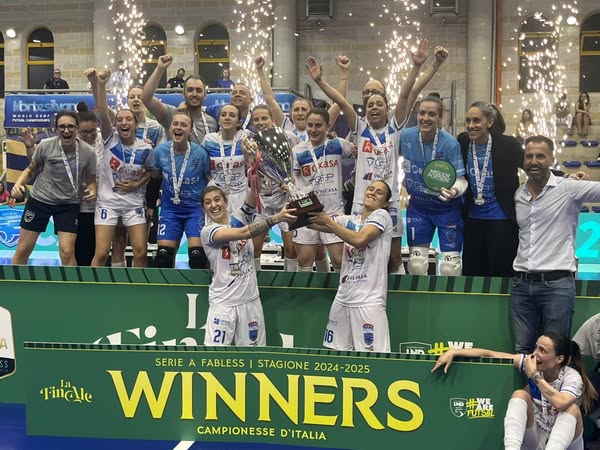 I gol di Sestari (due, il primo da lancio del discobolo più che da futsal) ed Elpidio, le trame tarantolate di capitan Ferrara, la furia agonistica di Isa Pereira, l’eleganza di Cortes, la poliedricità di Balardin, le gomitate “d’autore” di Praticò. La perfezione scritta in quello stesso cielo da cui spiove il pallone del 2-2 fiondato dalla “Disum-Ana” . La rimonta annunciata porta all’abbraccio collettivo della sirena. Non c’è più separazione tra parquet e tribuna, tra giocatrici e tifosi, tra lacrime e sorrisi. Dal catino abruzzese rimane solo la consapevolezza di aver fatto qualcosa che resta. Perché vincere è difficile. Ma ricostruirsi — dal dubbio — e tornare a vincere, di più.