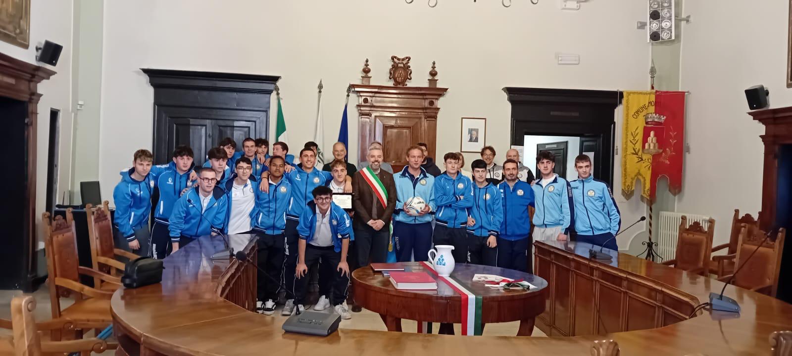 Celebrato il successo dei giovani della Juniores della squadra del paese marchigiano, accolti ieri pomeriggio in comune dal Primo Cittadino di Monte San Vito Thomas Cillo. A 30 anni dall’ultima volta che i baby bianco azzurri hanno vinto il campionato di categoria, per un settore rinato da poco e subito vincente, oltre ogni difficoltà.