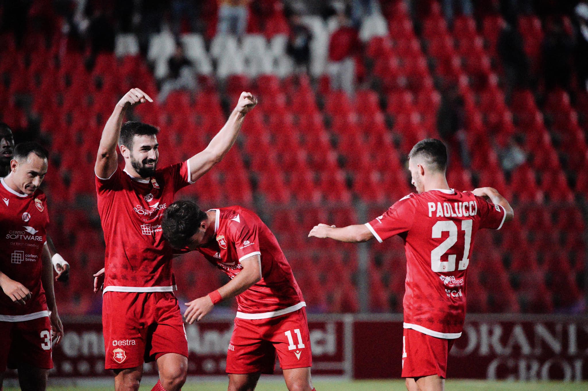 Il dorico Paolucci, autore della terza rete dell’Ancona, festeggiato dai compagni (foto profilo FB Ancona Calcio)