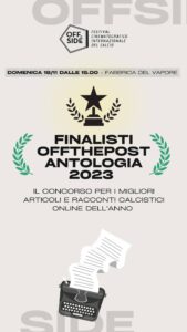 Andrea Pongetti inoltre, sarà anche tra i finalisti in lizza per il Premio “Off The Post Anthologia 2023”, dedicato ai migliori articoli calcistici pubblicati on-line nell’anno 2023.