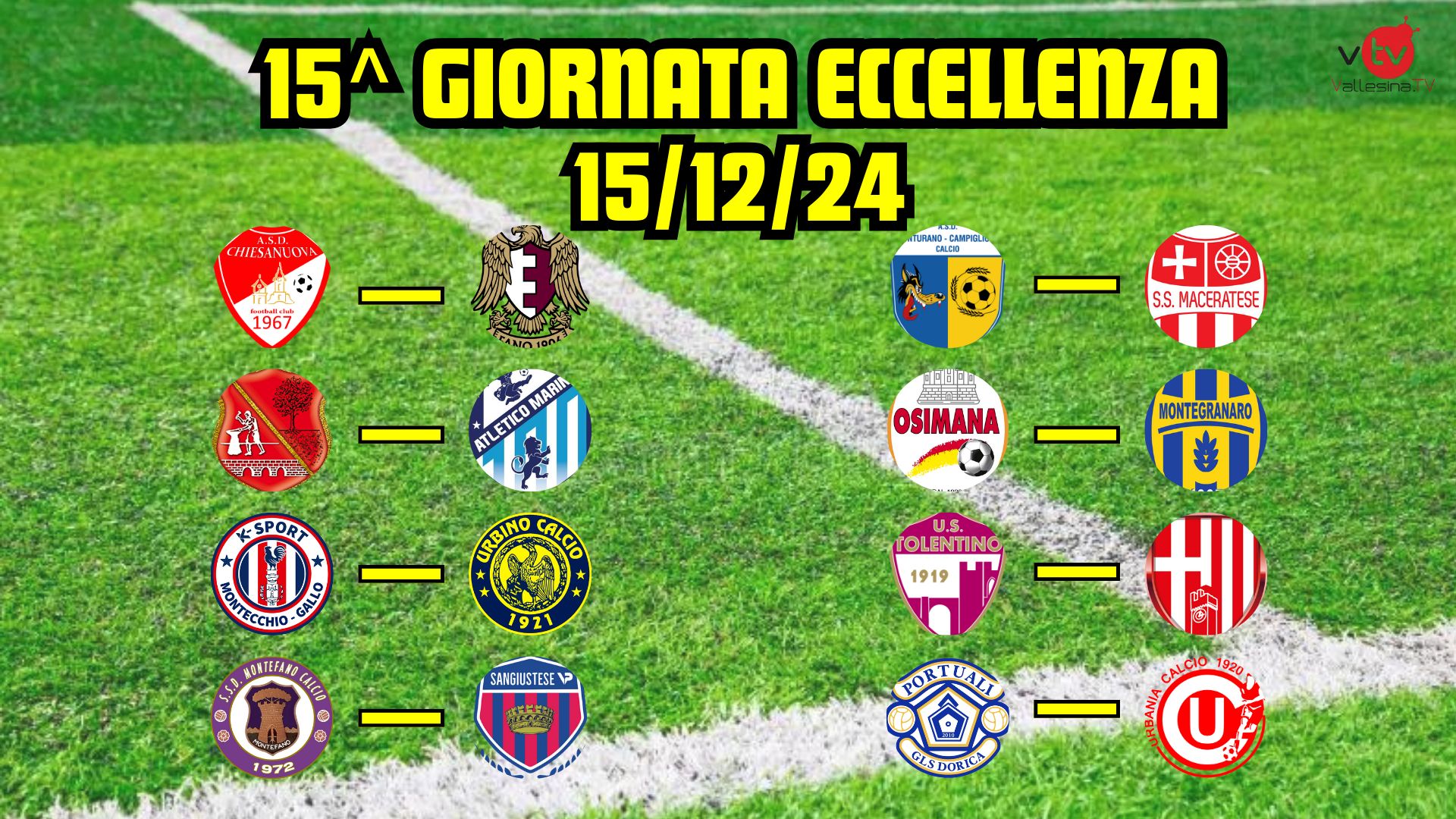15^giornata Eccellenza: Monturano-Maceratese (Crincoli di Ascoli), Chiesanuova-Alma Fano (Paladini di Lecce), Fabriano Cerreto-Atletico Mariner (Latuga di Pesaro), K Sport-Urbino (Malascorta di Jesi), Montefano-Sangiustese (Negusanti di Pesaro), Osimana-Montegranaro (Denti di Pesaro), Tolentino-Matelica (Tasso di Macerata), Portuali-Urbania (Maiellaro di Parma)