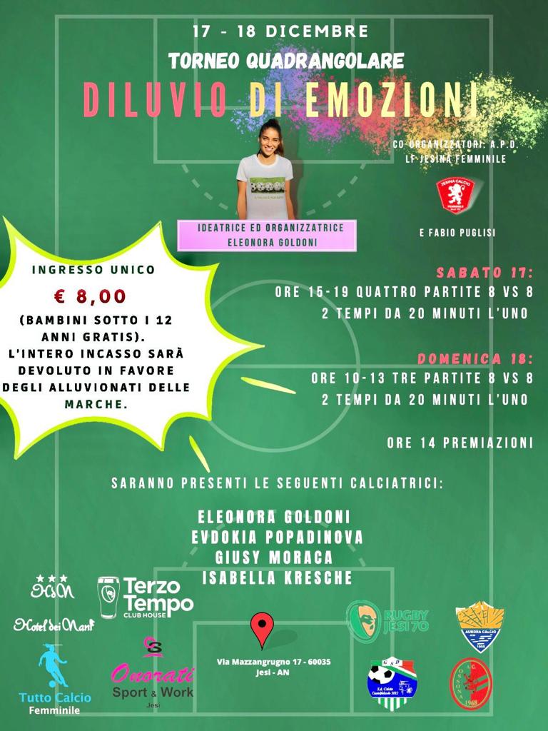 Nel fine settimana, 17 e 18 dicembre, coorganizzato dalla Jesina calcio femminile in collaborazione con Fabio Puglisi procuratore di diverse giocatrici del calcio femminile, con la presenza di Onorati Sport ed il Rugby Jesi, oltre alla calciatrice di serie A (Sassuolo) Eleonora Goldoni, ideatrice ed organizzatrice, si terrà un quadrangolare dal titolo ‘diluvio di emozioni’ con incasso, 8€ al botteghino, che sarà devoluto in favore delle popolazioni alluvionate delle Marche.