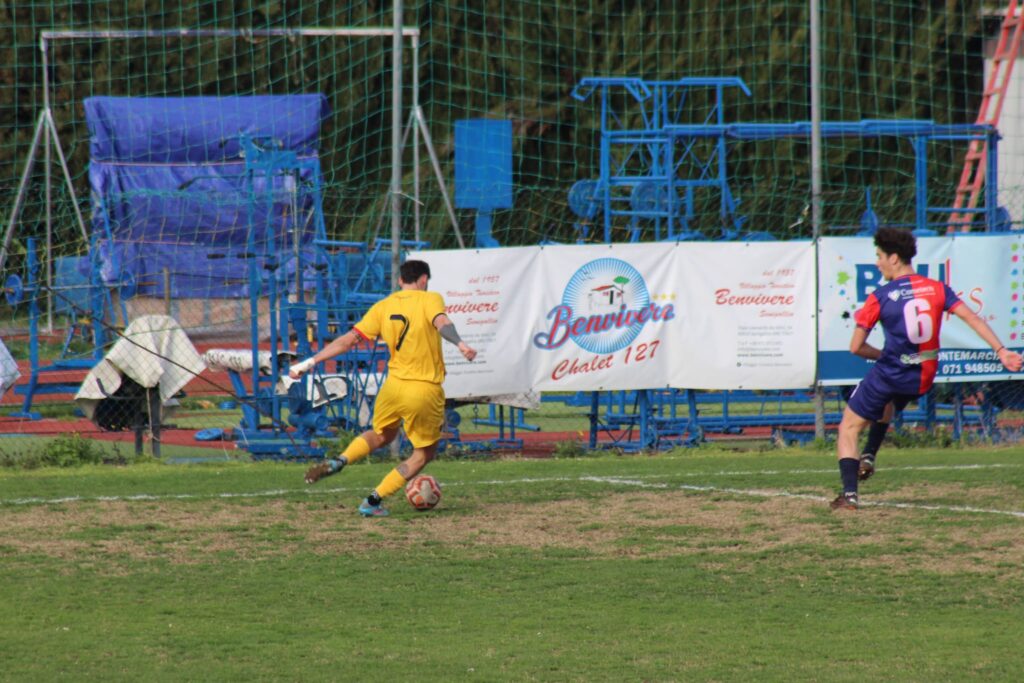 Minuto numero 7: Bruni sbaglia a rinviare il pallone, Rossini lo recupera sui 20 metri, appoggia per Serfilippi che scambia con Severini, entra in area e con un tocco leggero batte il portiere ospite per l’1-0 dei padroni di casa. Il Sassoferrato Genga reagisce con un tiro di Perini su una palla vagante al limite dell’area, con la sfera abbondantemente fuori. Dall’altra parte Cardinali colpisce fuori di testa su cross da angolo di Severini.