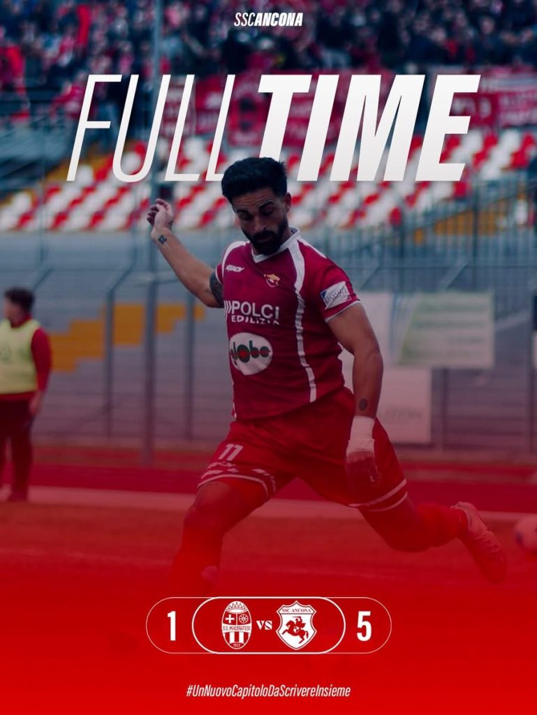 ANCONA, 26 ottobre 2025 – Derby a tinte biancorosse, ma solo per l’Ancona. La formazione di mister Maurizi si impone con un roboante 1-5 sull’SS Maceratese 1922 al “Comunale Helvia Recina”, firmando una prestazione maiuscola per intensità, qualità e concretezza.
