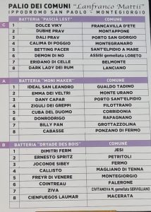 Ventiquattro i cavalli in gara in rappresentanza di 26 Comuni, tutti marchigiani con l’aggiunta di due Comuni ospiti, uno abruzzese (Lanciano), l’altro umbro (Assisi, abbinata a Loreto).