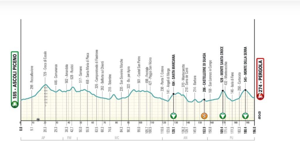Sarà una tappa molto mossa costellata di salite impegnative, almeno nove e alcune catalogate come GPM. La corsa transiterà sulle pendici del Monte San Vicino.
