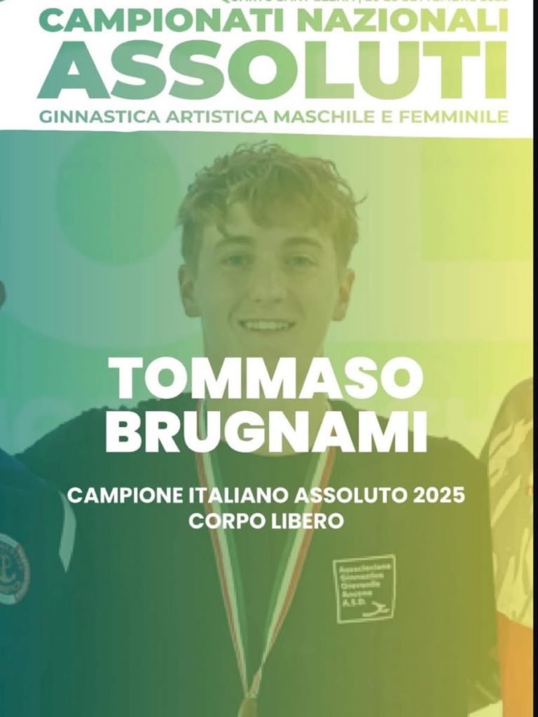 Brugnami domina: doppio oro al debutto tra i senior. Protagonista assoluto della giornata è stato Tommaso Brugnami, il 19enne marchigiano di Borghetto di Monte San Vito, in forza alla Ginnastica Giovanile Ancona e allenato da Fabrizio Marcotullio. Al suo esordio assoluto tra i senior, Brugnami ha impressionato per solidità e maturità tecnica, conquistando due titoli nazionali: al corpo libero e al volteggio.