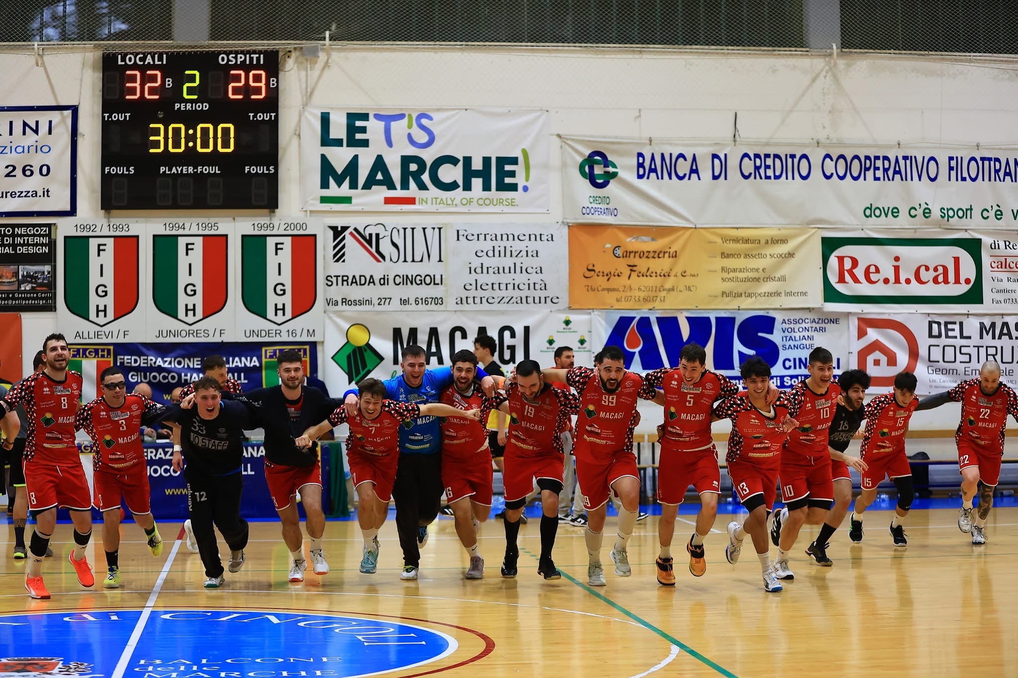 Qui i cingolani piazzano l’allungo decisivo. Mangoni pareggia, D’Antino sbaglia de volte, così Renaud firma il nuovo vantaggio locale sul 28-27. Il possibile pari di Francesco Rossi finisce sul palo, così Makhlouf segna il 29-27 al 55’ con uno splendido pallonetto a porta vuota da 30 metri. Hamouda accorcia, poi Pressano sbaglia un tiro in situazione di superiorità numerica da extra-player. Cingoli ne approfitta e con i gol di Mangoni, Strappini e Renaud vola sul +4 del 32-28 all’alba dell’ultimo minuto. Il gol di Soria serve solo a portare in parità gli scontri diretti, visto il 32-29 dell’andata. La festa del PalaQuaresima può finalmente iniziare.