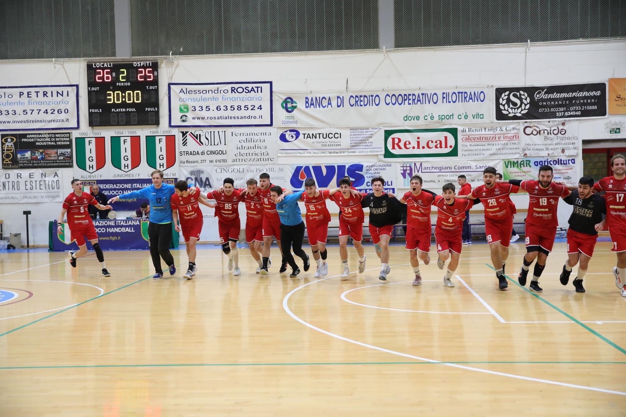 Camerano non si dà per vinto e trova il 26-25 con uno 0-3 firmato Laera, De Grandis e Cirilli: l’ultima rete del grande ex, però, arriva a 5 secondi della fine, così Cingoli gestisce l’ultimo possesso facendo scorrere il tempo, con la sirena che sancisce la fine del derby.