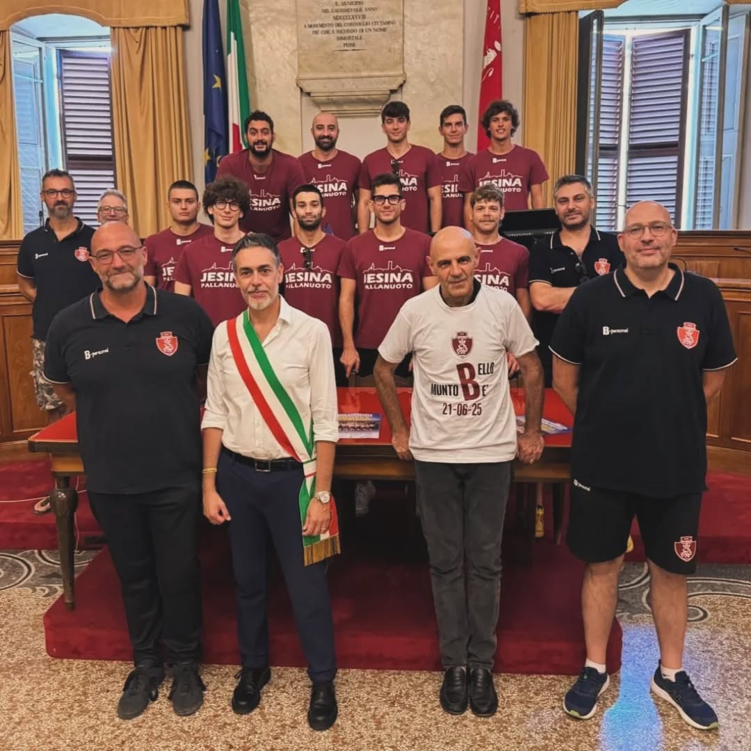 JESI, 19 luglio 2025 – La Jesina Pallanuoto è stata ospite in Comune per ricevere la Medaglia della Città grazie alla vittoria conquistata di recente al Palablù di Moie contro Prato che è valsa per vincere il campionato di serie C ed il passaggio in serie B.