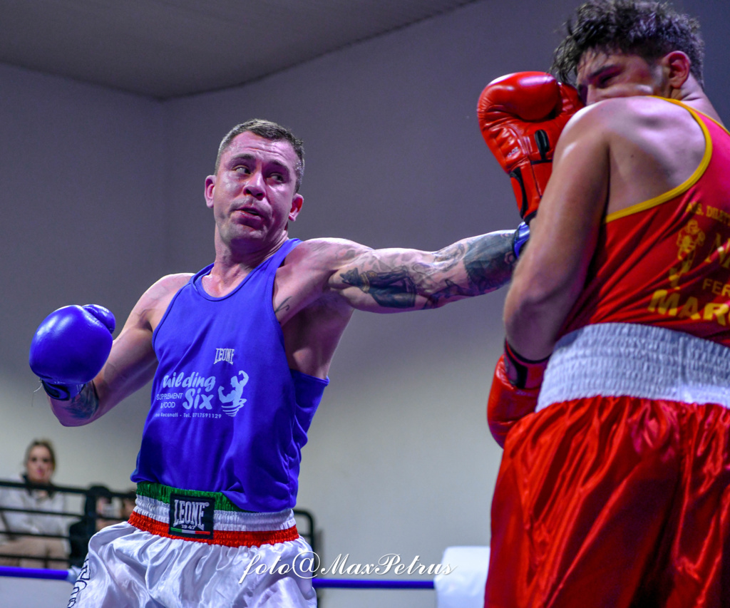 Match pari pure tra i 71 kg Nicola Pagliarini della Nike Fermo e Giovanni Polverari dell’Audax Boxe Fano. Vittoria indiscussa invece per Daniel Mieczyslaw (canotta blu in primo piano) della BC Castelfidardo su Michele Belleggia (canotta rossa in primo piano) della Nike Fermo. Nella categoria dei 60 kg vince ai punti Alessandro Fiorentini dell’Ascoli Boxe contro Ivano Zerulo dell’Academy Boxe Loreto.