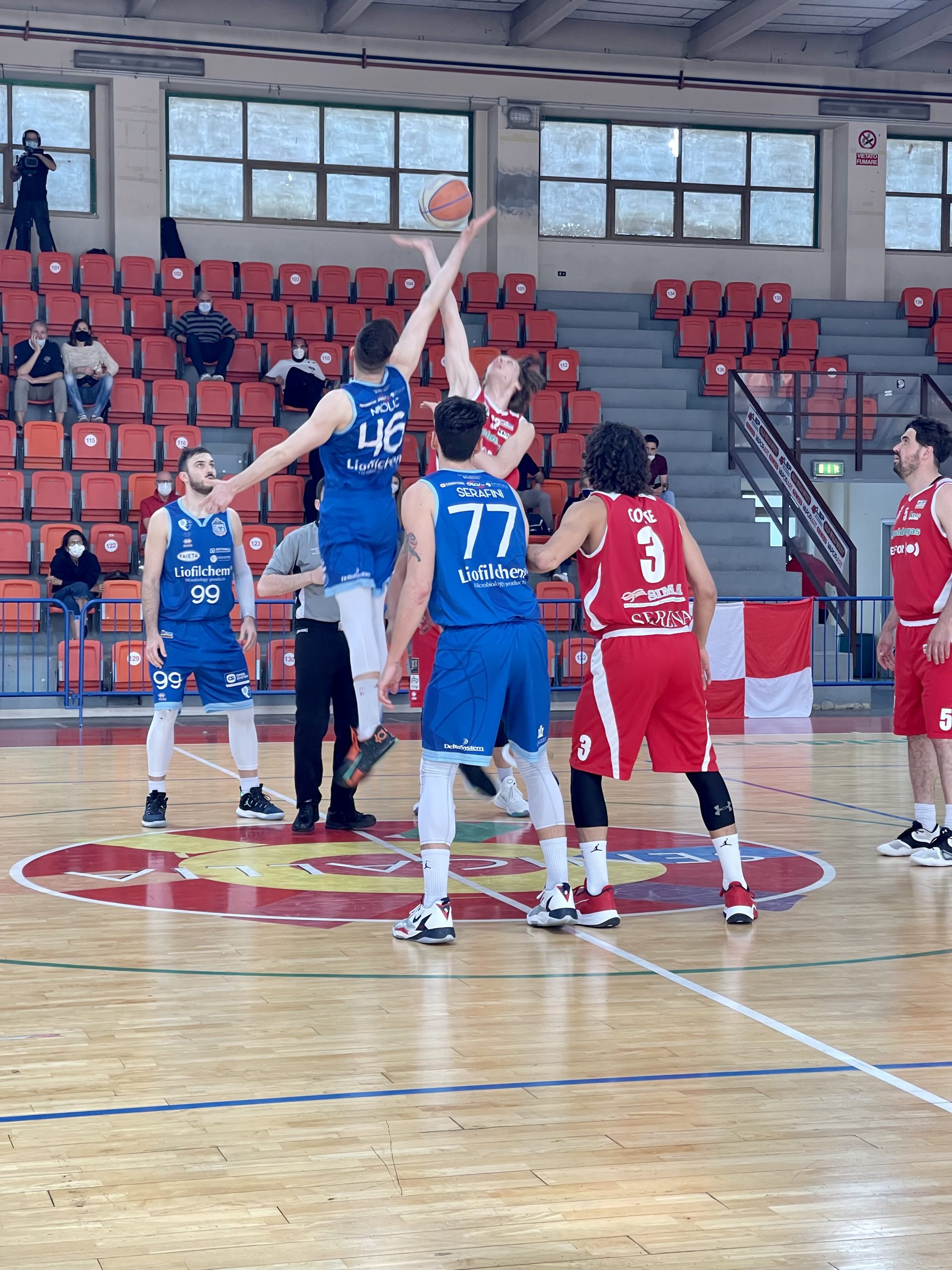Al via, come previsto, Senigallia oltre a Peroni, ceduto al Rimini in settimana e Giacomini (infortunato) deve rinunciare pure a Pozzetti, alle prese con dolori alla schiena: del quintetto titolare ci sono solo Gurini e Pierantoni, affiancati da Giunta, Conte e Cicconi Massi; Trullo invece non ha Pastore, da tempo infortunato.