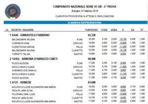 Nella giornata di ieri ottime le fabrianese, che hanno conquistato 92,350 punti, staccando di oltre un punto l’Armonia di Abruzzo Chieti che, nonostante una grande prova al cerchio del talento Vlada Nikilchenko, si è dovuta accontentare di un secondo posto a 90,900 punti.