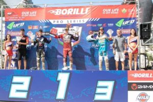 Cherubini (primo sul podio) con il presidente del Moto Club Fagioli Luigi Ciattaglia all’epoca della Vittoria della Coppa Mille Dollari