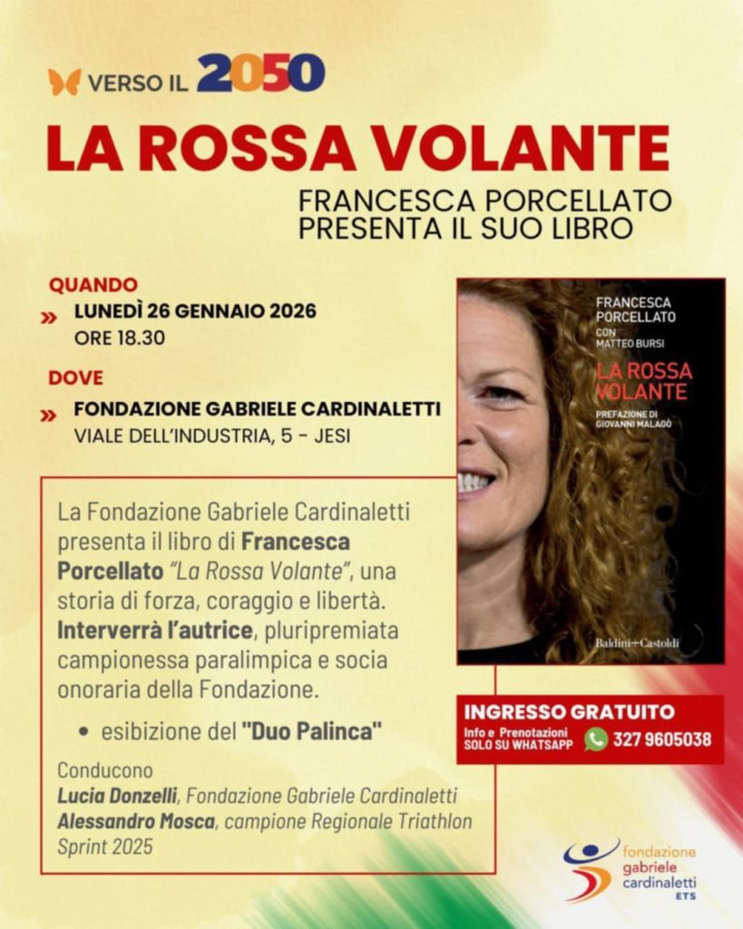 Jesi, 17 gennaio 2026 – Lunedì 26 gennaio alle ore 18:30 la “Fondazione Gabriele Cardinaletti Ets” ospiterà l’atleta paralimpica, fondista e paraciclista Francesca Porcellato.