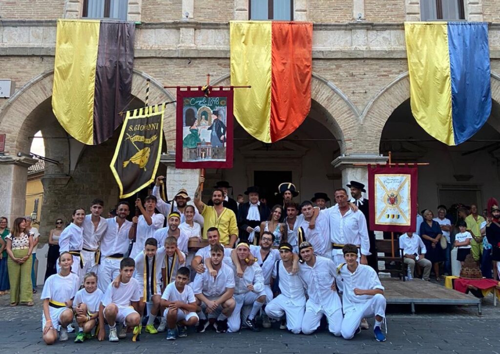 CINGOLI, 21 luglio 2024 – Il terziere di San Giovanni Battista vince per il secondo anno consecutivo i giochi storici della 35^ Rievocazione Storica “Cingoli 1848”. I gialloneri, infatti, si aggiudicano il XII Palio “Castrvm Cingvli” dominando la competizione contro gli altri due terzieri di San Nicolò e Santa Maria. L’evento si è svolto tra il 20 e il 21 luglio a Cingoli. I giochi storici junior, invece, sono stati vinti da San Nicolò.
