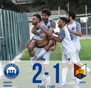 Vittoria importantissima per il Trecastelli, che rimonta l’iniziale svantaggio, si porta a casa l’importantissimo big match con il Real Mombaroccio per 2-1 e tenta una prima fuga in classifica. Gli ospiti passano al vantaggio grazie a Ricci, che al 7° sigla una grande punizione e gela l’OMCE Arena. I biancoblu non mollano la presa e si riportano subito in avanti alla ricerca del pareggio, che arriva grazie alla conclusione vincente di Marini al 34°. Ripresa equilibrata, con le due squadre che si alternano nel predominio del gioco e si scambiano continuamente il possesso. Il colpo della vittoria arriva grazie a Grossi, che colpisce di testa sul cross di Carboni e firma la