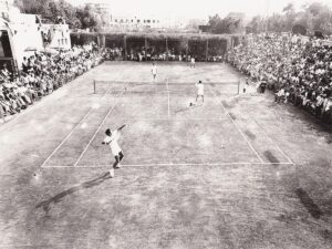 Nelle foto, Nicola Pietrangeli impegnato a Senigallia; un match di doppio sul Centrale del Ponterosso; i campi come si presentano oggi; Ion Tiriac in una immagine più recente.